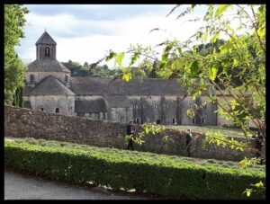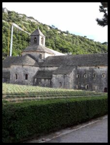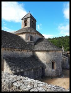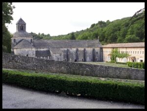 Qu’on vienne de Gordes ou de Vénasque, la route est sinueuse et juste assez large pour se croiser, elle défile à travers un paysage de montagne à la fois minéral et boisé, proche de ce que l’on voit dans les Alpes du Sud : c’est évident le Mont Ventoux n’est pas loin ! Et alors qu’on ne s’y attend pas, elle apparaît, oohh quel choc, elle est là majestueuse dans son écrin de nature sauvage. Plantée devant l’entrée de l’abbaye, tout en admirant les bâtiments, mes pensées vagabondent. Je comprends le choix du lieu fait, il y a presque 9 siècles en 1148, par les premiers cisterciens venant de Mazan en Ardèche. Tout est là pour assurer le respect rigoureux et quotidien de la Règle de Saint Benoît « Ora et labora » et vivre en « Pauvres du Christ » comme se définissent les cisterciens :