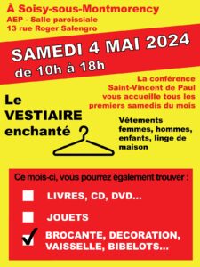 Comme tous les premiers samedis du mois, la conférence Saint-Vincent de Paul vous donne rendez vous ce samedi de 10h à 18h au vestiaire enchanté. A samedi !!!!